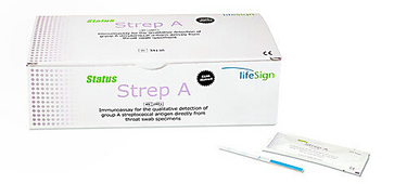 Packaging and test strip for the Status Strep A Rapid Point-of-Care Test, which is used for detecting group A streptococcal antigen from a throat swab sample. Packaging and test strip for the Status Strep A Rapid Point-of-Care Test, which is used for detecting group A streptococcal antigen from a throat swab sample.